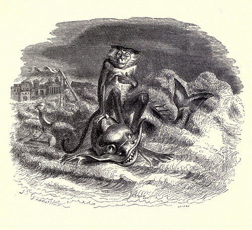 Otro animal es el Delfín de La Fontaine, un animal bonito, y del que el hombre tiene una buena concepción. Pero este Delfín es un delfín cartesiano, y La Fontaine advierte un desprecio del razonamiento por el animal, todo esto en su fábula “El mono y el delfín”. En esta fábula, tras un naufragio, un delfín salva a un mono tomándole por un hombre, y cuando el Delfín le pregunta que si es de Atenas y si frecuenta el Pireo, el mono, creyendo que el Pireo es un hombre, le dice que sí, que son muy amigos, a lo que el Delfín, viendo que ese “hombre” era estúpido, le deja en alta mar para que se ahogue. El Delfín se comporta como un hombre racionalista, mal para ser un animal; hace lo que un cartesiano haría, pero en realidad el Delfín es bobo. No es un hombre, porque no sabe responder: es una máquina. Actúa como un niño, se equivoca donde no hay equívoco. Es similar a las urracas y a los loros de Descartes en el Discurso del Método: hablan sin que un yo acompañe a su representación. Y nosotros somos cartesianos, porque popularmente se considera que los animales no piensan ni tienen lenguaje.